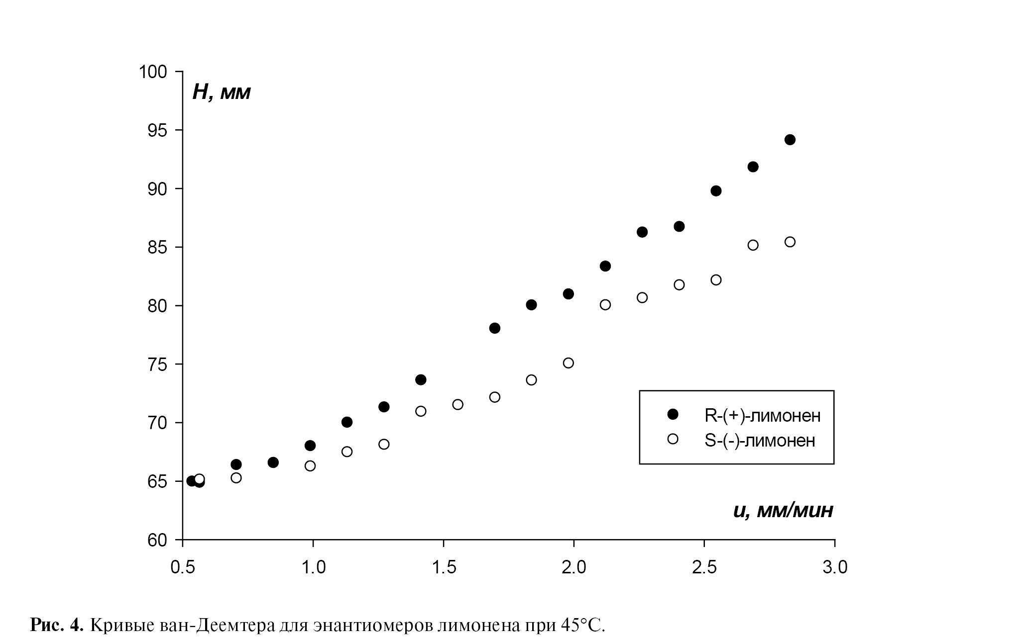 Рис. 4. Кривые ван-Деемтера для энантиомеров лимонена при 45°С.