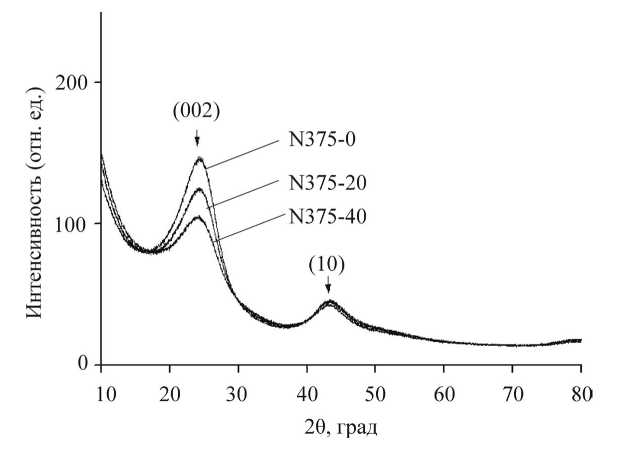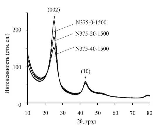 Рис. 1. Дифрактограммы углеродных образцов: N375-0, N375-20, N375-40.