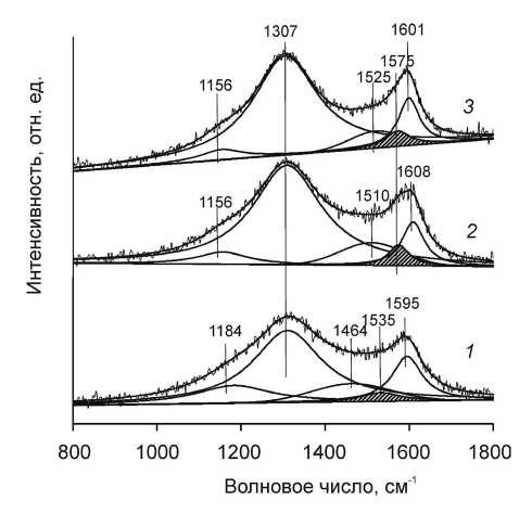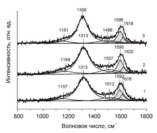 Рис. 9. Рамановские спектры образцов после низкотемпературной графитизации N375-0-1500 (1), N375-20-1500 (2), N375-40-1500 (3)