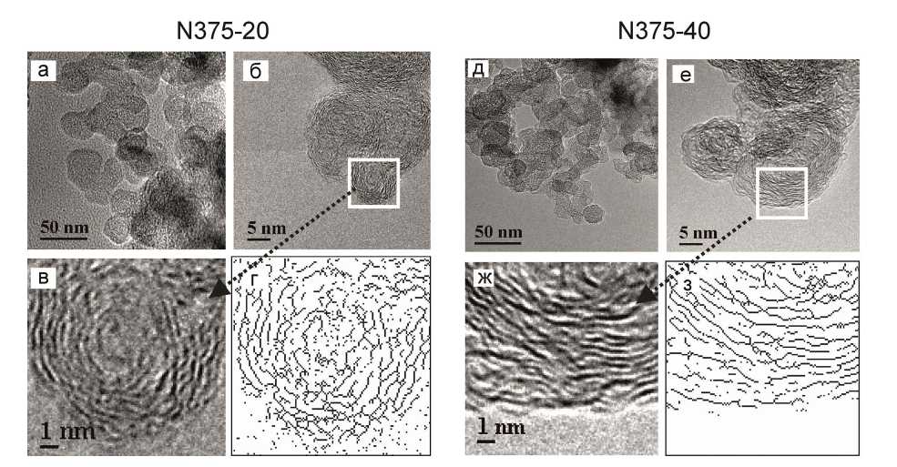 Первичные частицы образца N375-20 (рис. 5 а-в) в основном аналогичны частицам образца N375-0 за исключением некоторых особенностей. Анализируя ПЭМ-изображения, можно видеть то, что происходит окисление углеродных слоев в центральной части глобул. В то время как окисление исходного ТУ при потере массы углерода 40% в образце N375-40 первичные частицы зачастую утрачивают глобулярную форму (рис. 5 д, з). В данном образце наблюдается возрастание протяженности графеновых слоев, а также наличие их большей взаимной параллельности в сравнении с образцом N375-0.