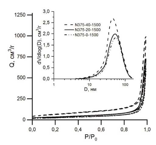 Рис. 10. Изотермы физической адсорбции-десорбции азота при 77 К на исследуемых углеродных образцах: N375-0-1500, N375-20-1500, N375-40-1500. Вставка – КРПР BJH