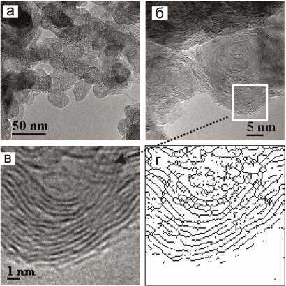 Рис. 11. a-г. Электронно-микроскопические изображения (а-в) и фрагмент структуры графеновых слоев, представленных в виде скелетонизированного изображения (г) образца N375-0-1500