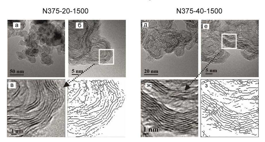 Рис. 12. Электронно-микроскопические изображения (а-в) и (д-ж), а также фрагменты структуры графеновых слоев, представленных в виде скелетонизированного изображения (г) и (з) образцов N375-20-1500 и N375-40-1500 соответственно