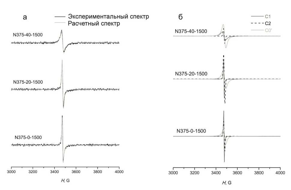 Образцы N375-0-1500 и N375-20-1500 имеют схожий вид спектров и отличаются преимущественно общей концентрацией ПЦ. В то время как для образца N375-40-1500 в результате графитизации наблюдается образование менее упорядоченного по структуре материала, в котором, тем не менее, присутствуют более протяженные графеновые слои, что проявляется в увеличении ширины сигнала C1.