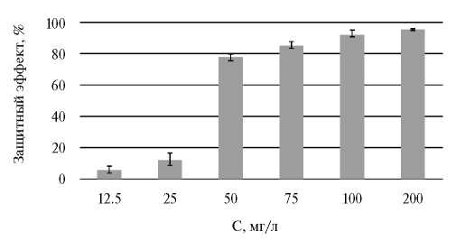 Рис. 2 показывает, что в диапазоне концентраций от 12,5 до 200 мг/л защитное действие АТД немонотонно возрастает с 6 до 96%, превышая 90% при концентрации 100 мг/л, что соответствует 0,7 ммоль/л.
