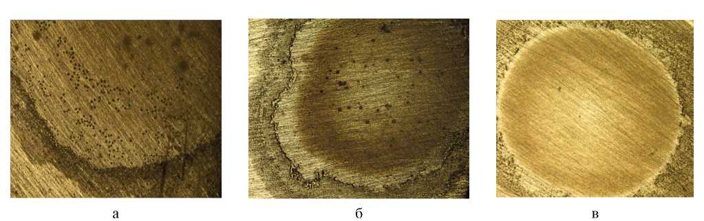 Рис. 3. Состояние поверхности Ст3 при контакте с раствором 0,5М серной кислоты в присутствии АТД в концентрациях (мг/л): а – 0, б – 50, в – 100. Увеличение 25