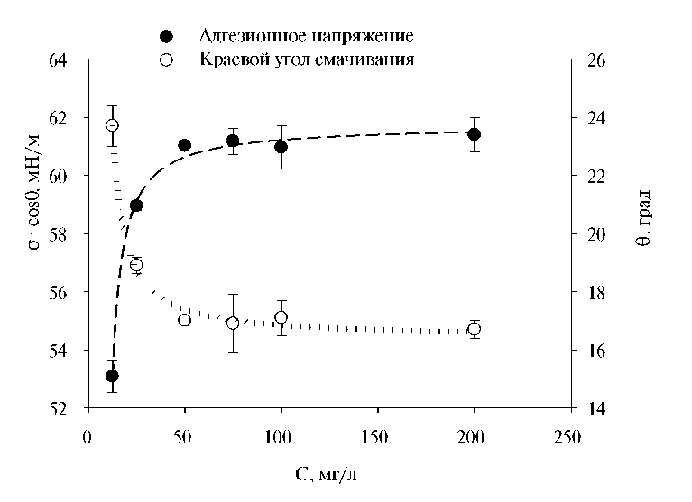 Рис. 4. Изменение краевого угла смачивания и напряжения адгезии при различной концентрации АТД