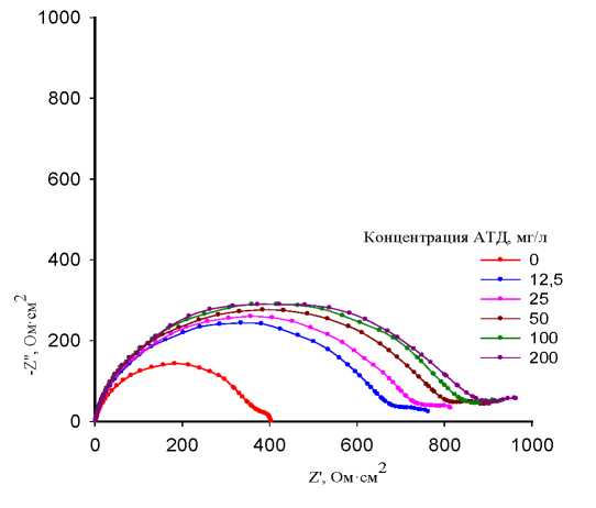 Рис. 8. Диаграммы Найквиста Ст3 в 0,5 М растворе серной кислоты в присутствии АТД