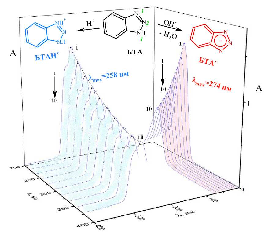 В области рН ≤ 0,6 в системе доминирует протонированная форма бензотриазола (БТАН+), при рН от 0.7 до 8.4 – молекулярная форма (БТА), а при рН ≥ 8.5 – анионная форма (БТА–) [10].