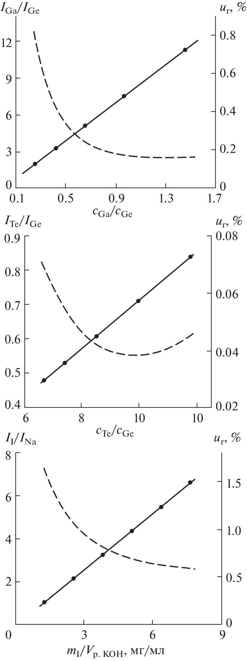 A procedure is developed for the high-precision determination of matrix elements of high-purity glasses of the Ga–Ge–Te–I system, containing from 5 to 15 at % Ga, from 10 to 20 at % Ge, from 69 to 75 at % Te, and from 1 to 6 at % I, using inductively coupled plasma atomic emission spectrometry. The procedure includes two stages independent of each other: determination of the ratio of the mass fractions of Ga and Te to the mass fraction of Ge (stage 1) and determination of the mass fraction of I (stage 2) in the glass sample. Based on these values, the mass and mole fractions of each matrix element of the analyzed sample were calculated. Sample preparation includes the acid dissolution (provides quantitative transfer of Ga, Ge, and Te into the solution) and alkaline opening (provides quantitative transfer of I into the solution) of samples. The accuracy of the results of analysis was confirmed by comparing the results of an analysis of model solutions and model glass samples with the calculated composition. The estimated uncertainty of the results of analysis is 0.05–0.1 at % at P = 0.95.