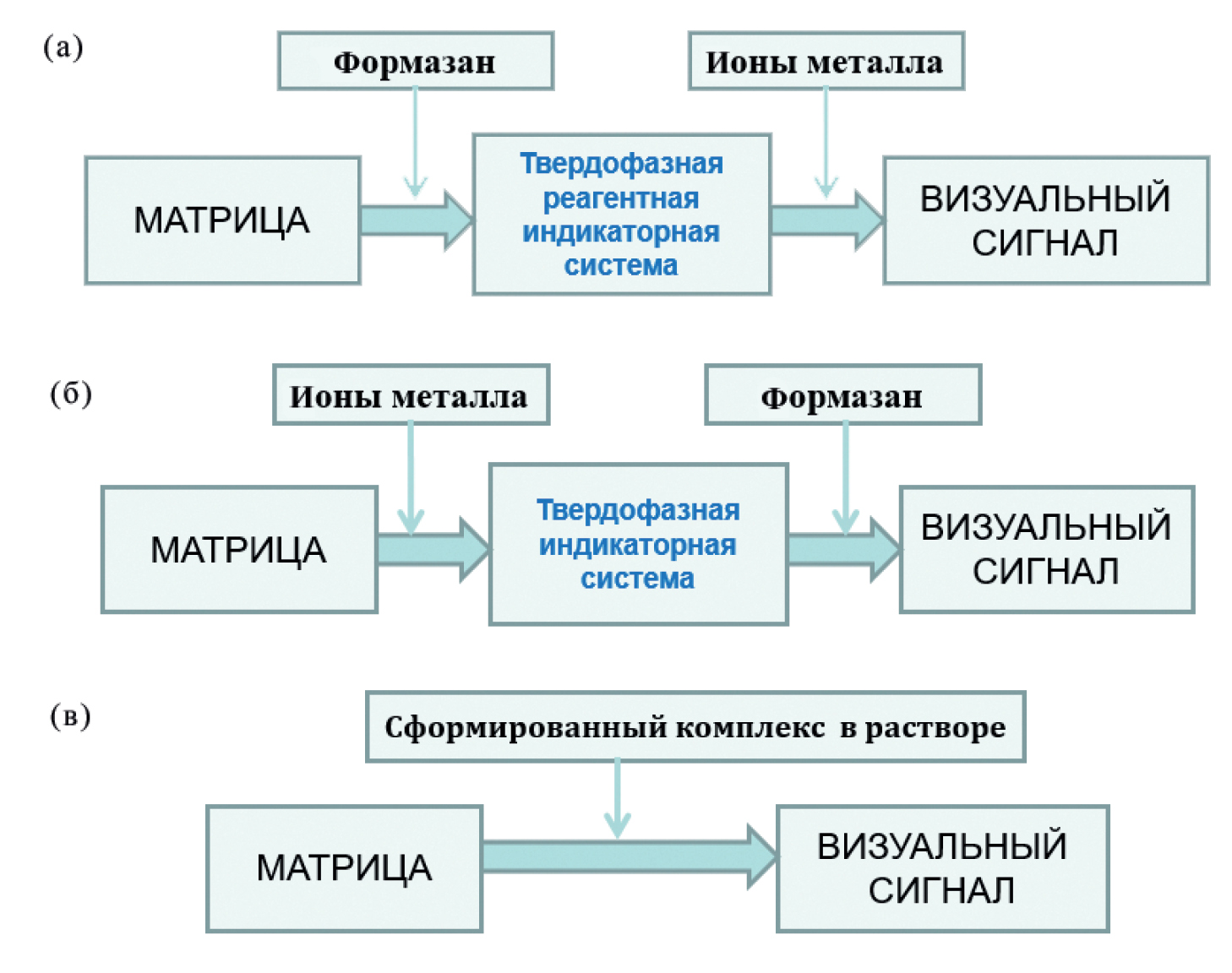 Твердофазные реактивные индикаторные системы с сорбцией сформированного в растворе комплексного соединения. Использование третьего варианта создания тест-систем позволяет избежать негативного влияния структурных и пространственных факторов, определяющих эффективность сорбции внутрикомплексного соединения на твердофазную матрицу, и при этом уменьшить время развития окраски, повысить селективность, чувствительность и точность измерения аналитического сигнала.