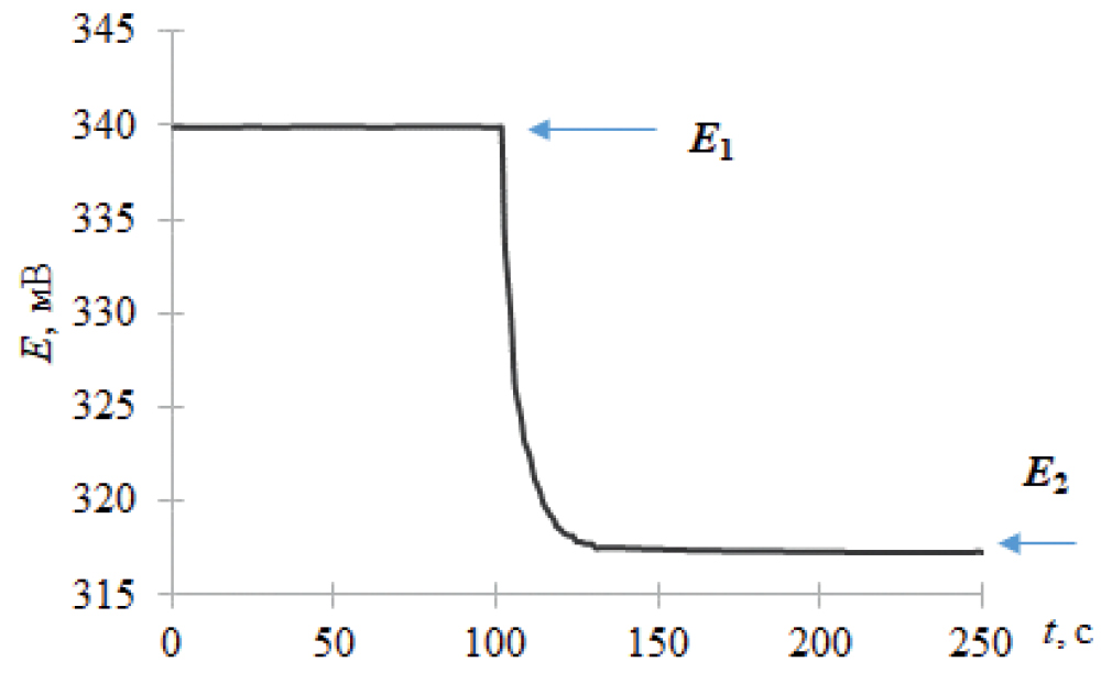 где АО – антиоксидант; АОOx – продукт окисления антиоксиданта, f – стехиометрический коэффициент перед антиоксидантом в реакции с K3[Fe(CN)6]. Типичный график зависимости потенциала от времени для предложенного метода приведен на рис. 1.