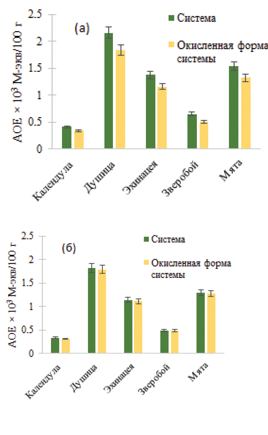 Рис. 6. Антиоксидантная емкость экстрактов растительного сырья без учета (а) и с учетом изменения наклона градуировочного графика (б)