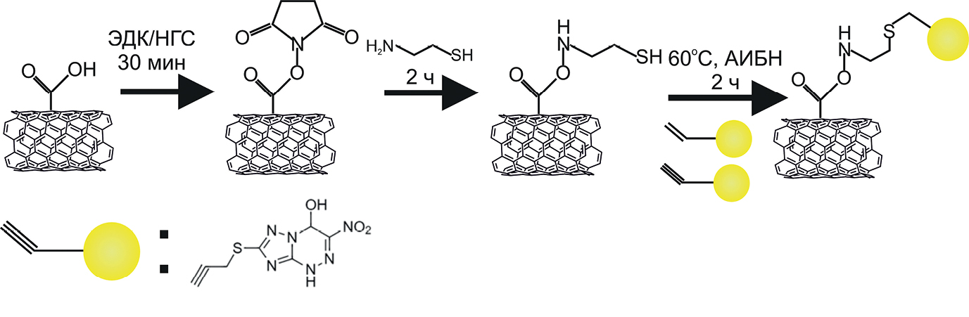 Модифицирование углеродных нанотрубок 2-пропаргилтио-6-нитро-7-гидрокси-4Н-1,2,4-триазоло-4,7-дигидро[5,1-с]-1,2,4-триазином. Синтезированное производное азолоазина иммобилизовали по реакции карбодимодной сшивки с аминоэтантиолом с последующей тиолиновой реакцией (рис. 1).