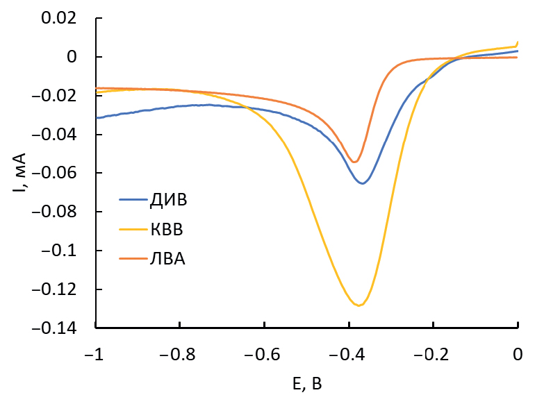 В выбранных условиях величина тока пика восстановления при переходе от ЛВА к ДИВ увеличивается в 1.15 раза, при переходе от ЛВА к КВВ – в 3.3 раза. Для дальнейшей регистрации электрохимического отклика Аза1 выбрали режим КВВ (рис. 3).
