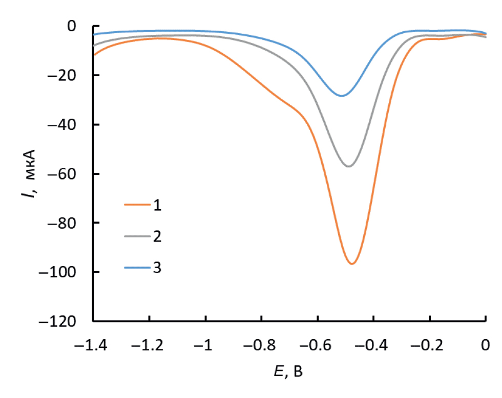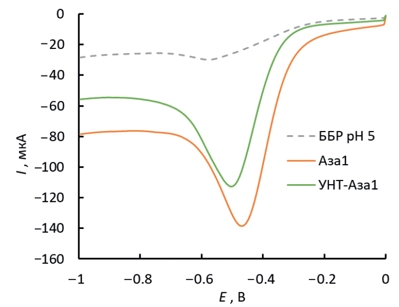 Рис. 4. Квадратно-волновые вольтамперограммы, зарегистрированные на стеклоуглеродном электроде после модификации электрода УНТ-Аза1, фоновый электролит – буферный раствор Бриттона–Робинсона, pH 5