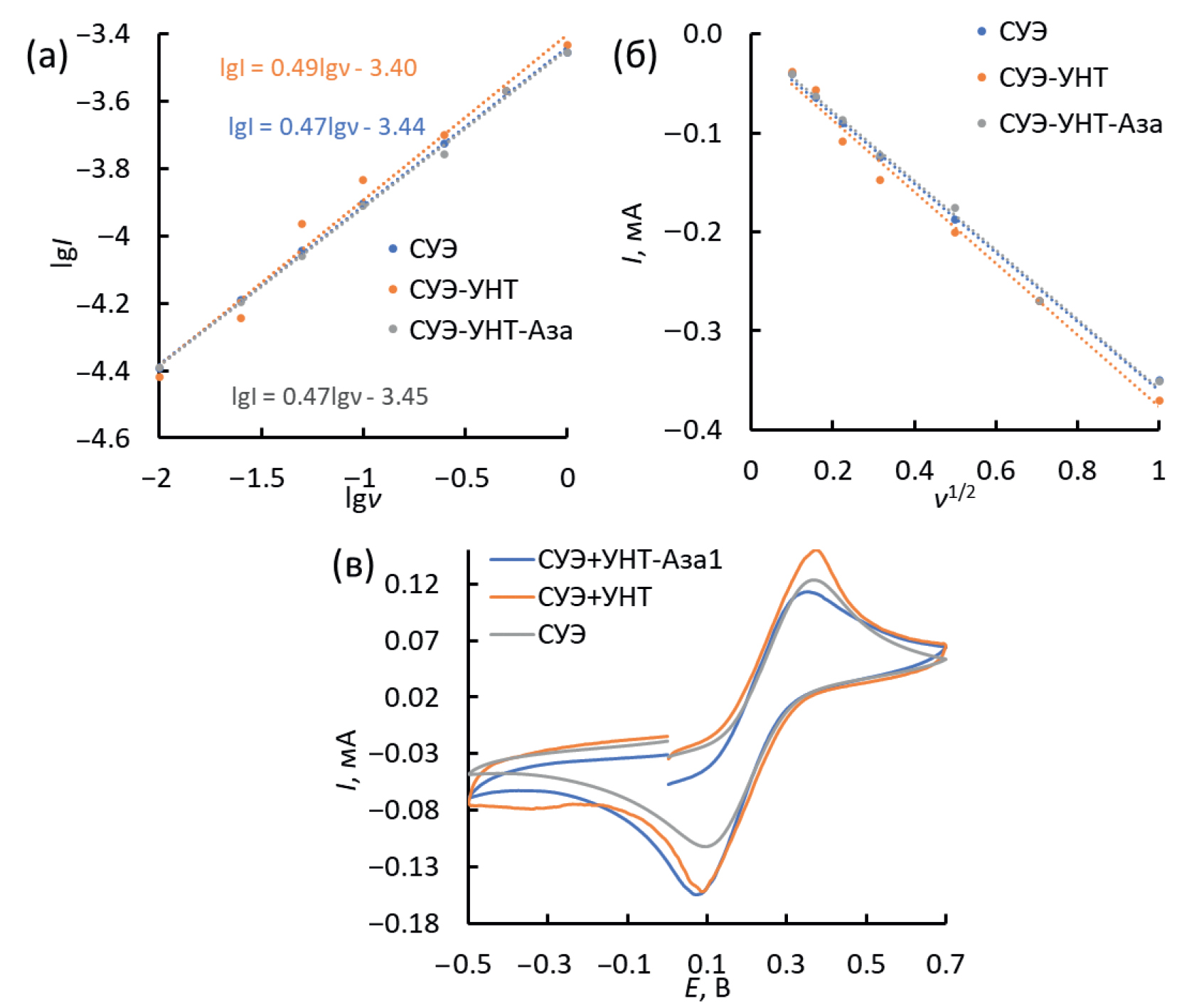 Рис. 5. Зависимости lg(I) = f(lgν) (а), I = f(ν1/2) (б), циклические вольтамперограммы (в), зарегистрированные на стеклоуглеродном электроде, модифицированном УНТ и УНТ-Аза1, в растворе 10 мМ K3[Fe(CN)6]/K4[Fe(CN)6], 0.1М KCl