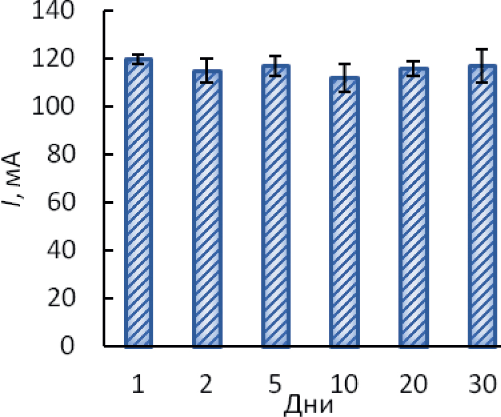 Полученные модифицированные наноматериалы характеризуются стабильностью в течение 30 дней с изменением величины электрохимического отклика в период хранения не более чем на 10% (рис. 6).