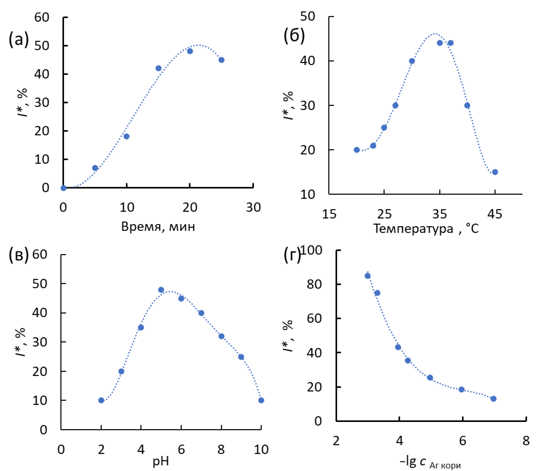 Рис. 8. Выбор рабочих условий: времени инкубации СУЭ-УНТ-Аза1 в суспензии Агкори (а), температуры (б), рН буферного раствора (в), концентрации Агкори (г)