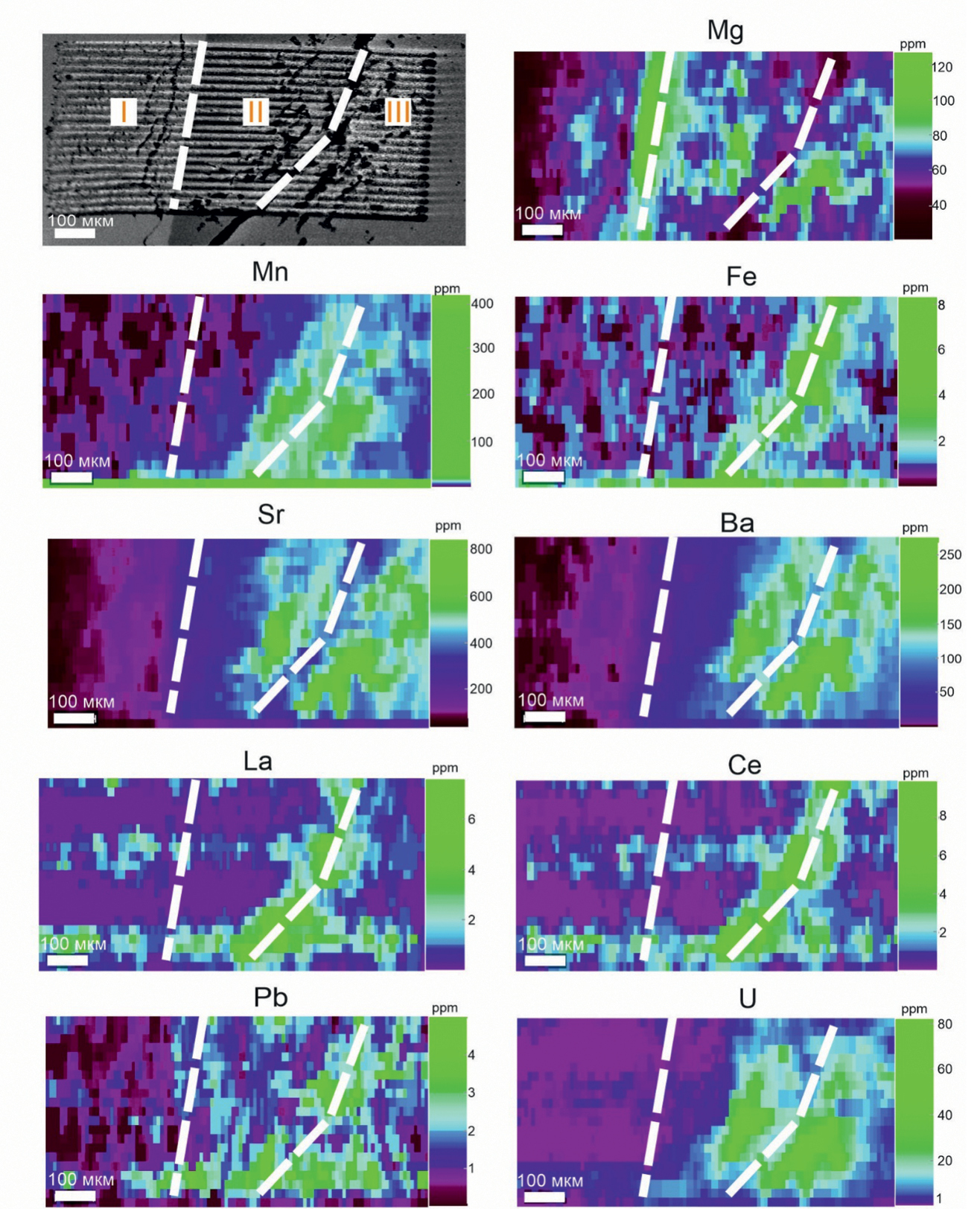 Из сопоставления элементных карт (см. рис. 2) видно, что повышенные концентрации практически всех элементов обнаружены в дентине с локальным обогащением в зонах трещиноватости, что указывает на поступление этих элементов с просачиванием поровых вод по трещинам более пористого дентина.