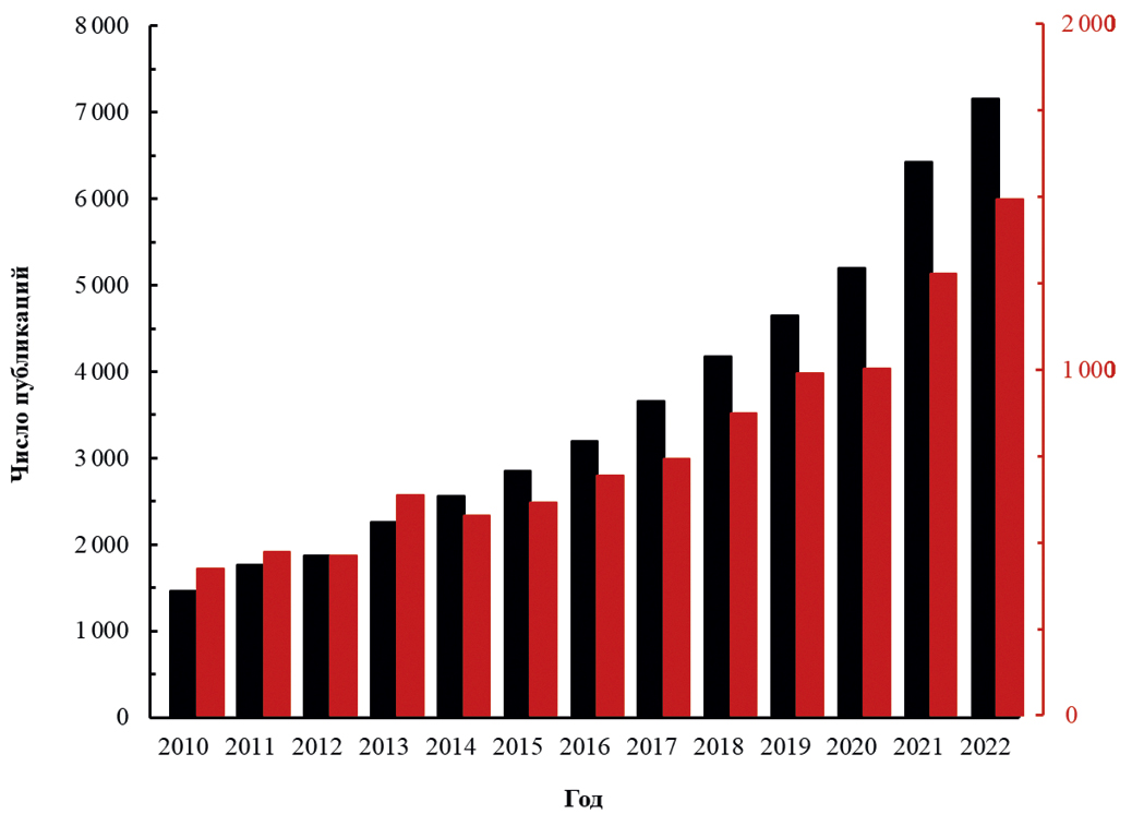 Рис. 1. Гистограмма, отражающая количество научных публикаций за период с 2010 г. по 2022 г. включительно, посвященных сферическим наночастицам серебра (■) и треугольным нанопластинкам серебра (■). Поисковые запросы Science Direct: silver spherical и silver triangular соответственно