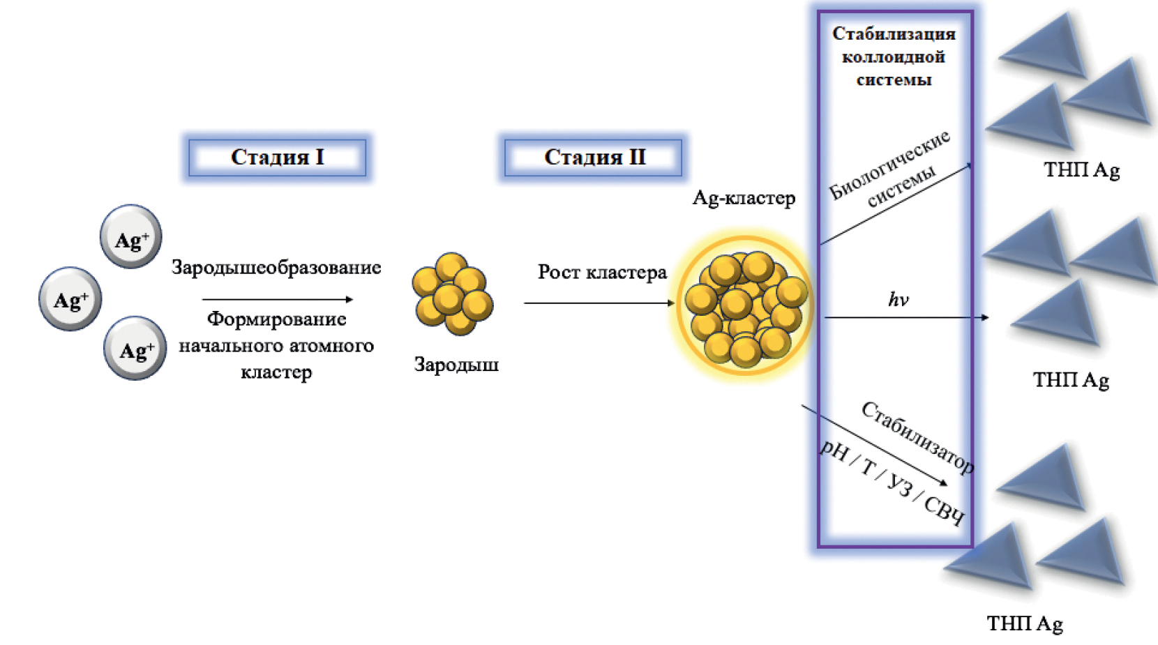Процесс образования наночастиц является достаточно сложным и включает в себя, как правило, ряд последовательных стадий: возникновение отдельных атомов, появление частиц-затравок (нуклеация), их рост до определенного размера и формирование наночастиц той или иной морфологии, что, как правило, контролируется действием стабилизирующего агента или влиянием внешних условий (электромагнитного излучения определенного спектрального диапазона, ультразвука и др.).