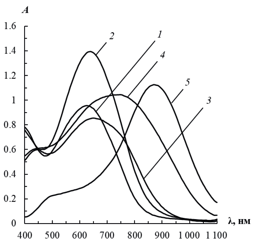 Рис. 4. Спектры поглощения водных растворов наночастиц серебра, полученных борогидридным методом. с(NaBH4), мМ: 25 (1), 35 (2), 45 (3), 70 (4), 100 (5); с(поли(N-винил-2-пирролидон)) = 21 мкМ