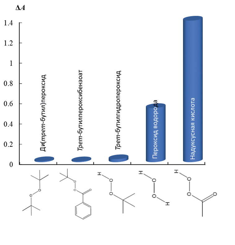 В случае трет-бутилгидропероксида, содержащего объемный трет-бутильный радикал, изменения проявляются в гораздо меньшей степени. При проведении экспериментов с трет-бутилпероксибензоатом и ди(трет-бутил)пероксидом, которые содержат в своих молекулах двузамещенную пероксогруппу и стерически объемные трет-бутильные радикалы, аналитический сигнал незначимо отличается от нуля (рис. 5).