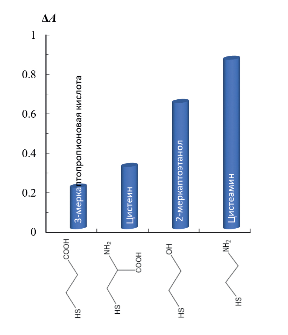 Значительные изменения спектральных характеристик наблюдаются при взаимодействии наночастиц с цистеамином и 2-меркаптоэтанолом, в меньшей степени – с цистеином и 3-меркаптопропионовой кислотой (рис. 6). Вероятно, механизм взаимодействия ТНП серебра с тиосоединениями включает в себя хемосорбцию аналита по группе –SH на поверхности наночастиц и последующую их агрегацию за счет образования межмолекулярных связей.