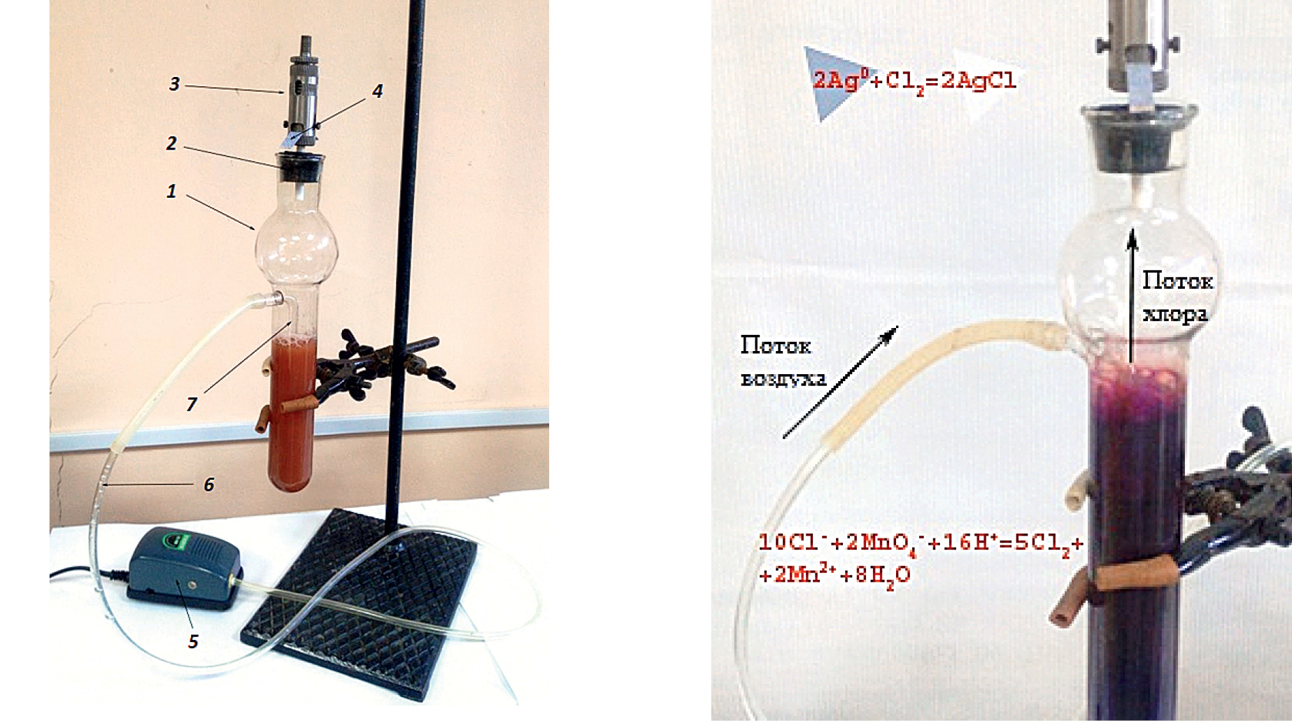 Рис. 10. Экспериментальная установка для проведения динамической газовой экстракции. 1 – стеклянный сосуд для анализируемого раствора (в данном случае – томатный сок); 2 – резиновая пробка; 3 – держатель для тест-полосок; 4 – бумажная тест-полоска; 5 – воздушный микрокомпрессор, 6 – полимерный шланг; 7 – стеклянный барботер (а). Схема одновременного in situ превращения хлорид-ионов в молекулярный хлор и его динамической газовой экстракции (б) [54]