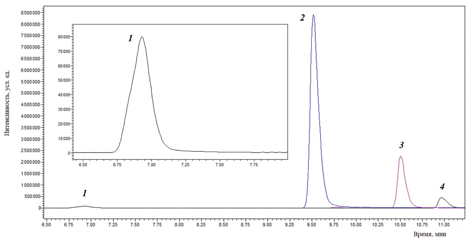 Рис. 4. Хроматограмма лекарственных веществ при использовании для стадии пробоподготовки ХМК-С16-100/Fe3O4: 1 – 4-хлорфенилмочевина (500 нг/г), 2 – дифлубензурон (500 нг/г), 3 – пиперонил бутоксид (50 нг/г), 4 – дельтаметрин (500 нг/г)
