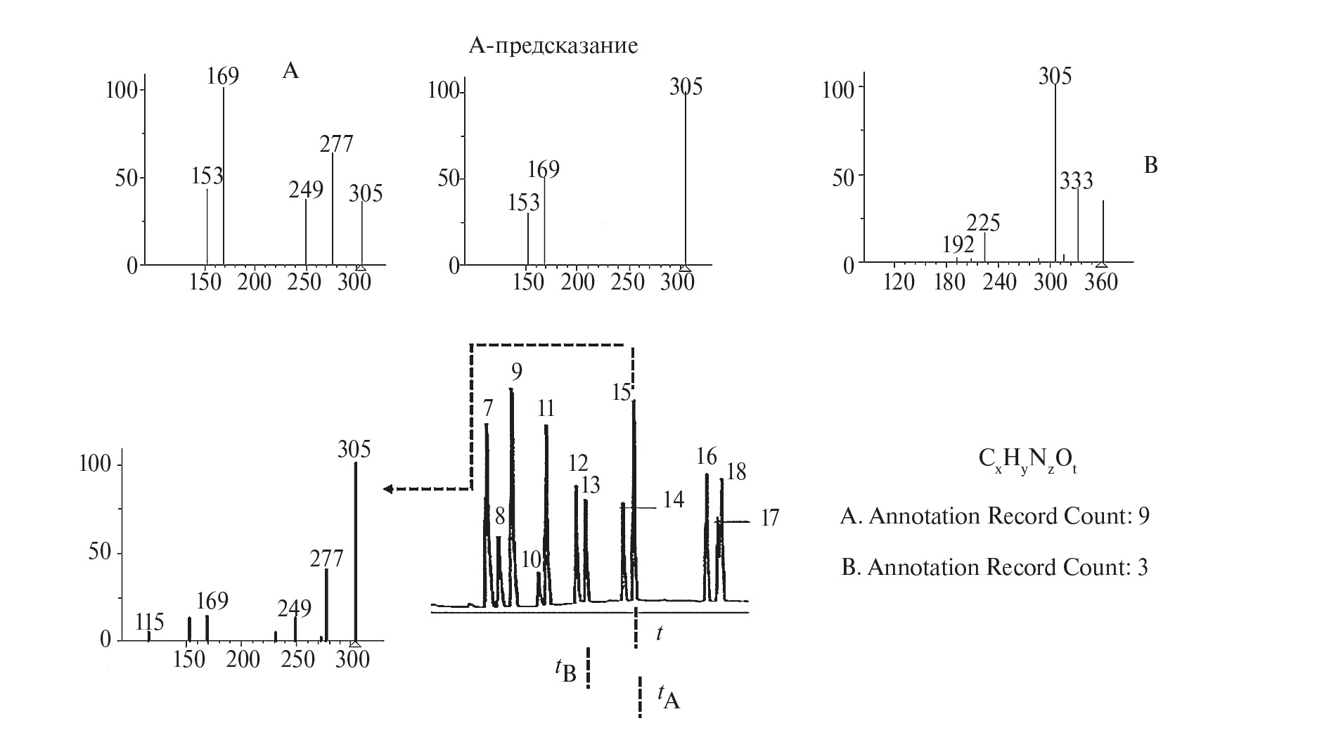 Рис. 1. Идентификация условного соединения А в рамках нецелевого анализа. Наблюдается удовлетворительное совпадение тандемного масс-спектра (левый нижний угол), соответствующего пику 15 на хроматограмме, со справочными спектрами соединения А (верхний ряд), в том числе с in silico спектром. Отличие от второго кандидатского соединения (В, правый верхний угол) гораздо более существенное. Время удерживания t также гораздо ближе к справочному значению для соединения А (tA). С использованием масс-спектрометрии высокого разрешения установлена брутто-формула неизвестного аналита CxHyNzOt, причем для аналита А обнаружено гораздо больше информации, чем для соединения В; приведен показатель Annotation Record Count – размер информационной справки – в базе данных PubChem [23] (см. далее).