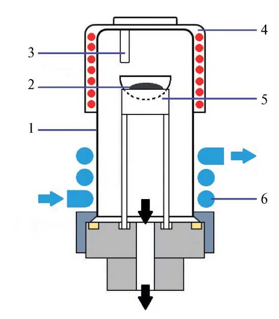Рис. 1. Схема установки для вакуумной дистилляции. 1 – кварцевая камера, 2 – кварцевая чаша с анализируемой пробой (1–3 г), 3 – углубление для датчика температуры, 4 – нагреватель, 5 – кварцевая подставка, 6 – охлаждающая трубка.