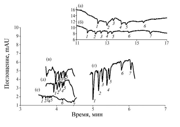 Рис. 1. Электрофореграммы модельной смеси нейтральных углеводов. Условия: система капиллярного электрофореза Капель-105М; капилляр 60×50 см, 50 мкм; фоновый электролит: 75 мМ NaOH, 0.5 мМ цетилтриметиламмоний бромид, 2.5 мМ поглощающая добавка: (а) микофеноловая кислота; (б) фолиевая кислота; (в) 4-аминосалициловая кислота; (г) акридонуксусная кислота; (д) бензойная кислота; (е) никотиновая кислота. U = –20 кВ, 20 оC. Длина волны при максимальном поглощении (см. табл. 1), ввод пробы: 2с × 30 мбар. Аналиты: модельный раствор углеводов (250 мкг/мл) 1 – фруктоза, 2 – глюкоза, 3 – мальтоза, 4 – лактулоза, 5 – лактоза, 6 – сукралоза, 7 – сахароза.