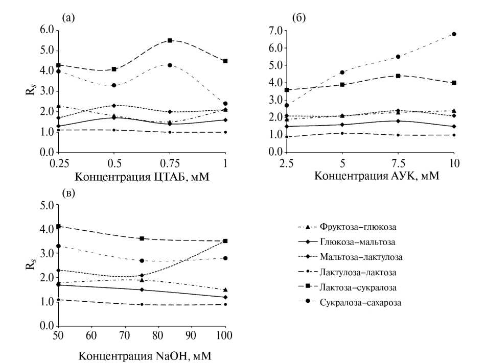 Влияние цетилтриметиламмоний бромида. Катионное ПАВ ЦТАБ при концентрации в растворе выше критической концентрации мицеллообразования (ККМ) образует мицеллы с формированием псевдостационарной фазы. Влияние ЦТАБ на параметры миграции углеводов исследовали в диапазоне концентраций 0.25–5.0 мМ (рис. 2в). При различной концентрации ЦТАБ в составе фонового электролита могут реализоваться два режима разделения аналитов: зонный – до достижения ККМ и мицеллярный – выше ККМ (0.9 мМ) [20]. При концентрации ЦТАБ выше 1 мМ ЭОП замедляется, происходит резкое снижение интенсивности сигналов, что объясняется, скорее всего, конкуренцией углеводов и АУК за полость мицелл. В результате увеличивается селективность разделения, но возрастают пределы обнаружения: при 5 мМ ЦТАБ они составляют 50–140 мкг/мл. В режиме капиллярного зонного электрофореза наибольшие значения факторов разрешения с наименьшими пределами обнаружения достигнуты в фоновом электролите, содержащем 0.5 мМ ЦТАБ.