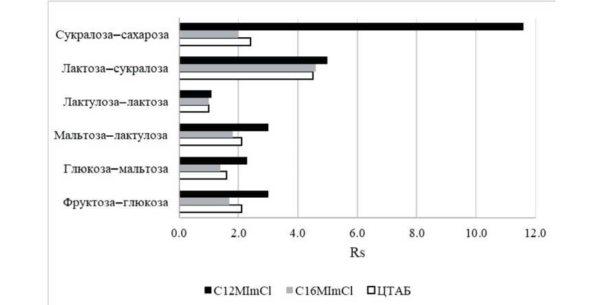 Влияние ионных жидкостей C12MImCl и C16MImCl на факторы разрешения углеводов. В качестве модификаторов ЭОП могут выступать ИЖ на основе имидазолия с длинным углеводородным радикалом [21]. Для исследования выбрали C12MImCl (ККМ = 7–15 мМ [22]) и C16MImCl (ККМ = 1.1 мМ [23]). Наибольшие значения факторов разрешения нейтральных углеводов наблюдаются при использовании ФЭ, содержащего C12MImCl (1 мМ) (рис. 3). Это объясняется тем, что C12MImCl слабее модифицирует стенки кварцевого капилляра, поэтому ЭОП в данном случае медленный, что приводит к росту селективности разделения аналитов. Пределы обнаружения составили 20–90 мкг/мл. В случае модификаторов с близкими значениями ККМ – ЦТАБ и C16MImCl – получили аналогичные результаты, однако пределы обнаружения аналитов для ЦТАБ оказались ниже (табл. 2).