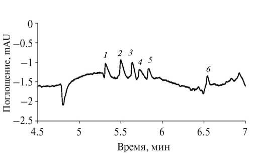 Рис. 4. Электрофореграммы смеси нейтральных углеводов c использованием в качестве поглощающей добавки С12MImCl. Условия: Капель-105М; капилляр 60×50 см, 50 мкм; фоновый электролит: 75 мМ NaOH, 10 Мм С12MImCl. U = –20 кВ, 20 оC. λ = 220 нм, ввод пробы 5 с×30 мбар. Аналиты: 1 – фруктоза, 2 – глюкоза, 3 – мальтоза, 4 – лактулоза, 5 – лактоза, 6 – сукралоза.