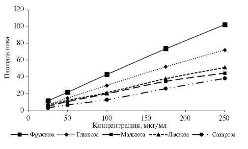 Рис. 5. Градуировочные кривые для определения углеводов в диапазоне концентраций 25–250 мкг/мл.