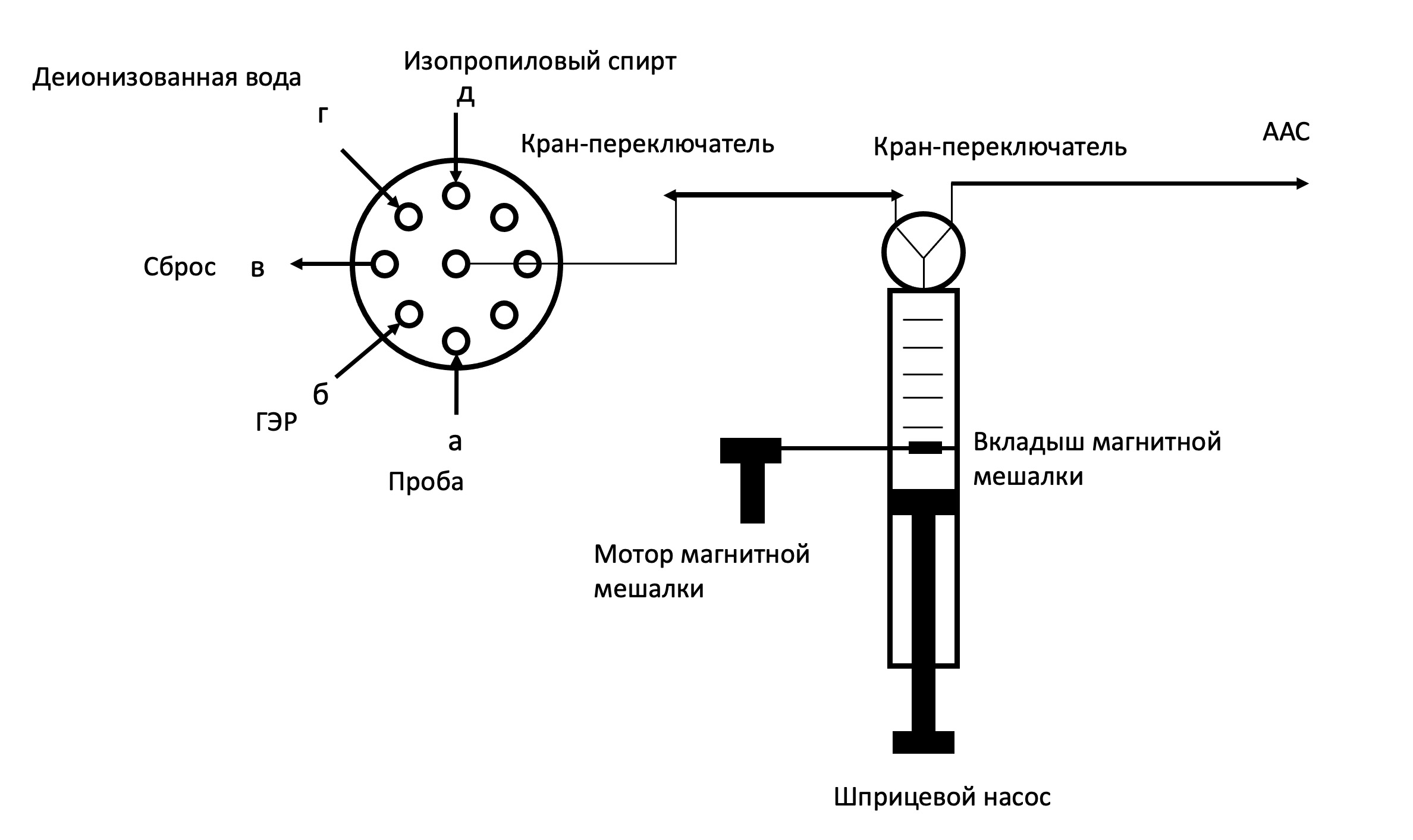 После перемешивания фаз в течение 10 с полученный раствор направляли на анализ. На последнем этапе в шприцевой насос отбирали 500 мкл изопропилового спирта (положение д крана-переключателя) для промывки.