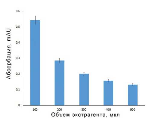 После остановки перемешивающего устройства и разделения фаз экстракт направляли в полипропиленовую пробирку, разбавляли в 10 раз деионизованной водой и анализировали. С уменьшением объема фазы ГЭР до 100 мкл значение аналитического сигнала (абсорбция) увеличивалось (рис. 3). При объеме фазы ГЭР менее 100 мкл невозможно отобрать экстракт без захвата фазы пробы.