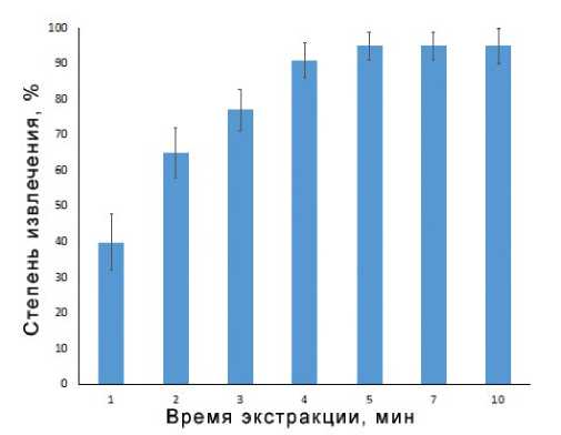 Поскольку масло и ГЭР являются вязкими жидкостями, процесс массопереноса может быть кинетически замедленным. Изучали влияние времени перемешивания фаз на эффективность массопереноса. Для этого раствор свинца в подсолнечном масле (4.0 мл, 25 мкг/кг) и ГЭР (100 мкл) перемешивали в шприце в течение 1−10 мин. Определили, что для установления равновесия в экстракционной системе требуется перемешивание фаз в течение 5 мин. (рис. 4).