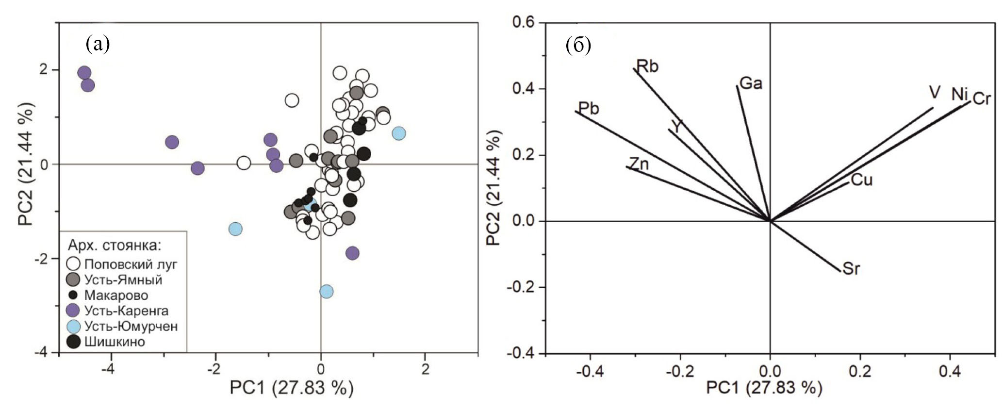 Рис. 1. Графики счетов (а) и нагрузок (б), рассчитанные для химического состава образцов керамики по археологической стоянке методом главных компонент.