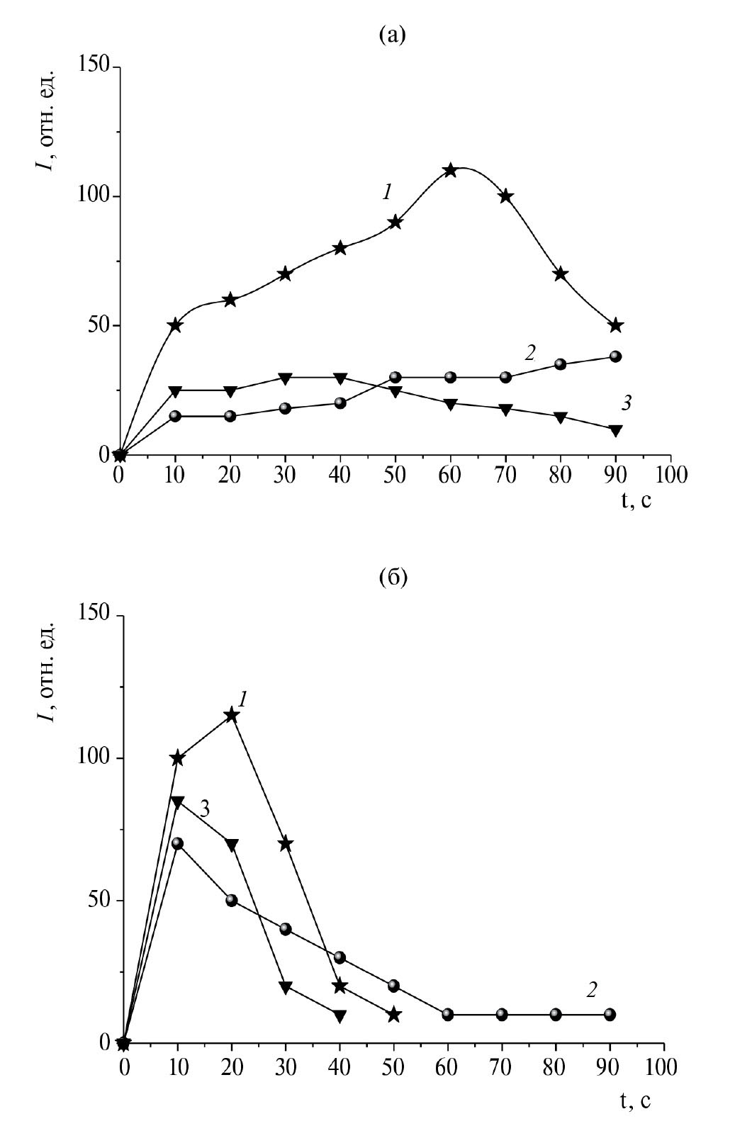 На рис. 1а, 1б приведены кривые испарения Mo и Si из оксида алюминия без добавок, с графитовым порошком, и в присутствии графитового порошка с фторидом цинка. Из рисунка видно, что смешивание оксида алюминия с графитовым порошком приводит к значительному уменьшению интенсивности спектральных линий (кривая 2), что нельзя объяснить лишь разбавлением графитом, так как концентрация последнего в оксиде алюминия составляет всего 30 мас. %. Вероятно, это происходит за счет образования труднолетучих карбидов. И даже введение фторирующей добавки (кривая 3) практически не приводит к росту интенсивности линий, т. е. присутствие графитового порошка существенно снижает действие добавки фторида. Аналогичные зависимости получены и для остальных примесных элементов.