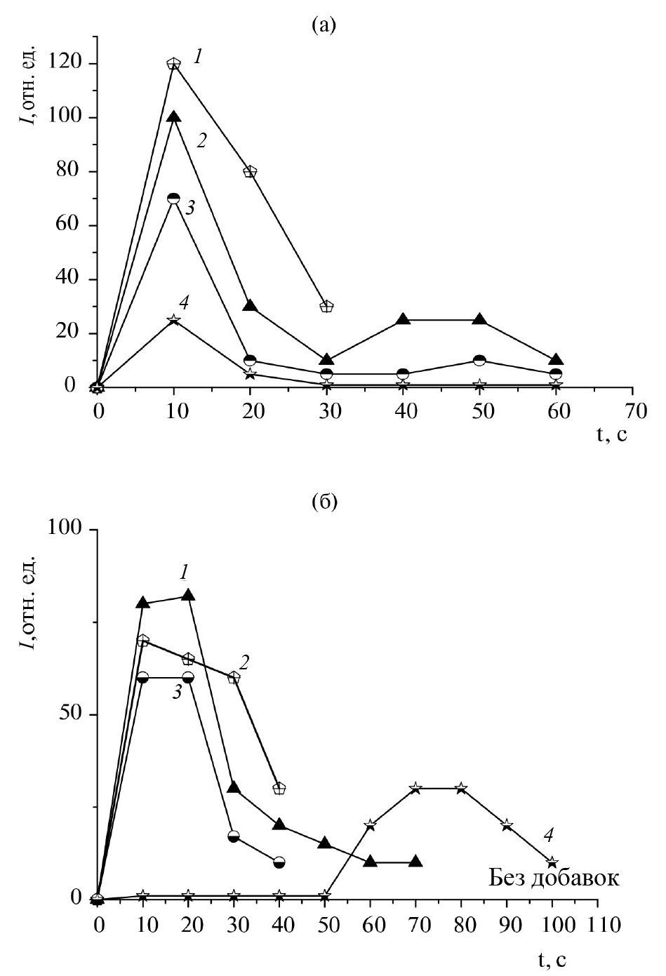 На рис. 2а, 2б приведены кривые испарения титана и гафния из кратера электрода дуги постоянного тока в присутствии всех исследованных добавок. Аналогичным образом выглядят кривые испарения в присутствии оптимальных количеств добавок и без добавки и для остальных изученных элементов. Оптимальное количество каждой добавки находили путем изучения зависимости интенсивности спектральных линий определяемых элементов от содержания добавки в оксиде алюминия. Для AlF3 и ZnF2 оно составило 15, а для AgF – 20 мас. %. Из рис. 2 видно, что все изучаемые фторсодержащие добавки способствуют более быстрому испарению труднолетучих элементов из кратера электрода. Если без добавки их основное испарение начинается только после 40 с, то в присутствии добавок оно происходит в течение первых 30 с горения дуги. Все исследуемые добавки способствуют также значительному росту интенсивности спектральных линий определяемых элементов. Максимальный рост интенсивности наблюдается в присутствии фторида цинка. Объяснить это можно, очевидно, следующим образом. Эффективная температура плазмы дуги (Тэф) при анализе оксида алюминия в атмосфере воздуха (Vi алюминия равен 5.98 эВ) составляет 5 900 оС [25]. Оптимальная температура плазмы (Топт) для возбуждения выбранных атомных спектральных линий исследуемых элементов, рассчитанная по предложенной в работе [26] формуле, составляет 5 600–5 800 оС. Известно [27], что введение в плазму дуги, горящую в атмосфере воздуха, элементов с низким Vi (5–6 эВ) вызывает снижение эффективной температуры плазмы дуги. При этом снижение температуры плазмы тем больше, чем ниже Vi вводимого элемента и больше его концентрация в столбе дуги. Введение в дугу элементов с высокими Vi (около 10 эВ) практически не влияет на эффективную температуру столба дуги. Следовательно, введение добавки ZnF2 (Vi цинка 9.393 эВ) в алюминиевую дугу не приводит к изменению ее эффективной температуры и она остается близкой к величинам Топт для возбуждения атомных спектральных линий определяемых в оксиде алюминия элементов. Использование добавок AlF3 (Vi алюминия 5.98 эВ) и AgF (Vi серебра 7.57 эВ) может вызывать снижение температуры плазмы дуги. Таким образом, значительное уменьшение времени полного испарения элементов-примесей из кратера электрода дуги и значительный рост интенсивности их спектральных линий в присутствии всех исследуемых добавок обусловлен образованием легколетучих фторидов.