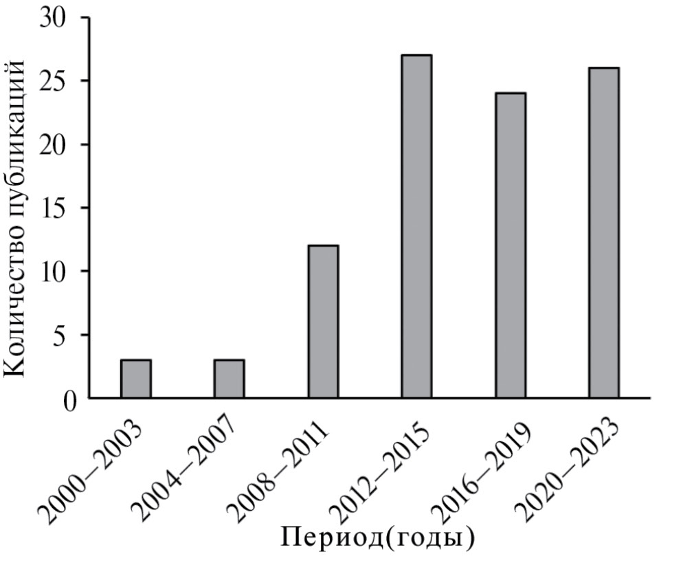 Рис. 2. Количество публикаций, посвященных микроэкстракционному выделению микотоксинов из пищевых продуктов, вышедших в свет, начиная с 2000 г. (на основании поиска литературных источников в Российской научной электронной библиотеке Elibrary и базе данных Scopus).
