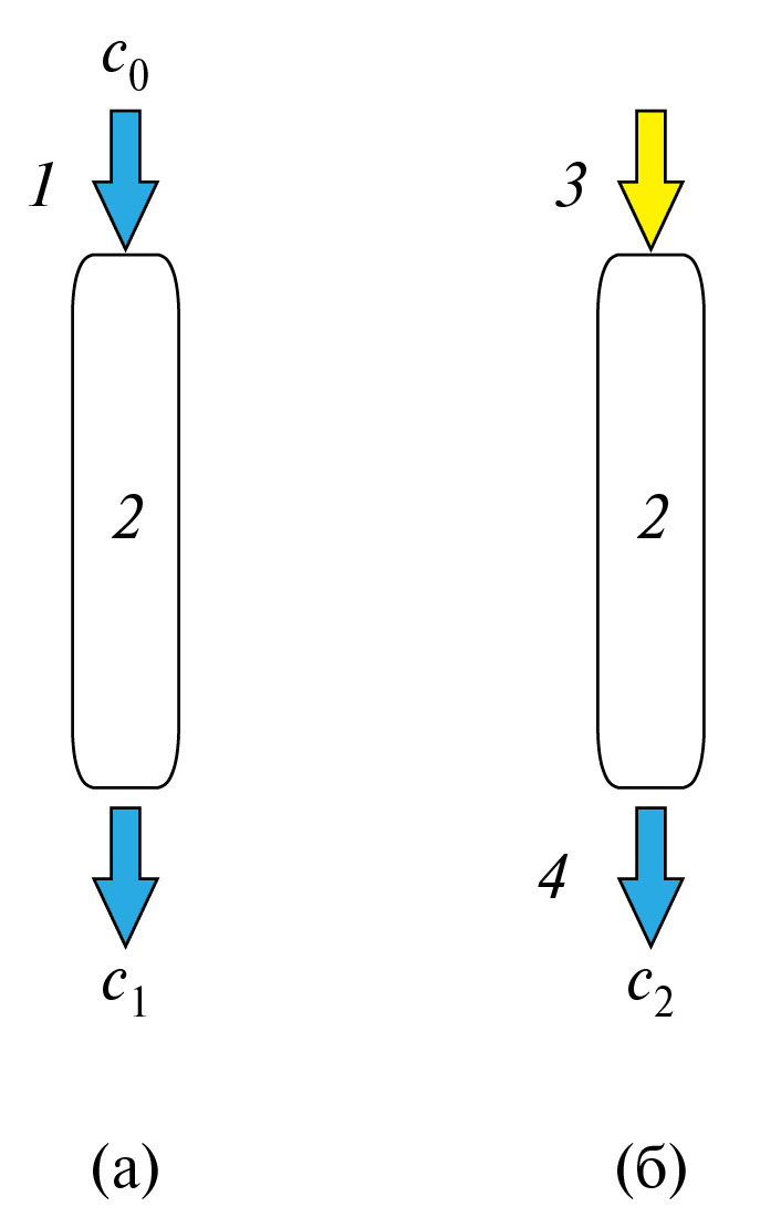 Рис. 2. Двухстадийная схема генерирования стандартных газовых смесей: (а) – первая стадия (насыщение); (б) – вторая стадия (десорбция). 1 – вход стандартной газовой смеси; 2 – сорбционная колонка; 3 – вход чистого газа; 4 – выход стандартной газовой смеси.