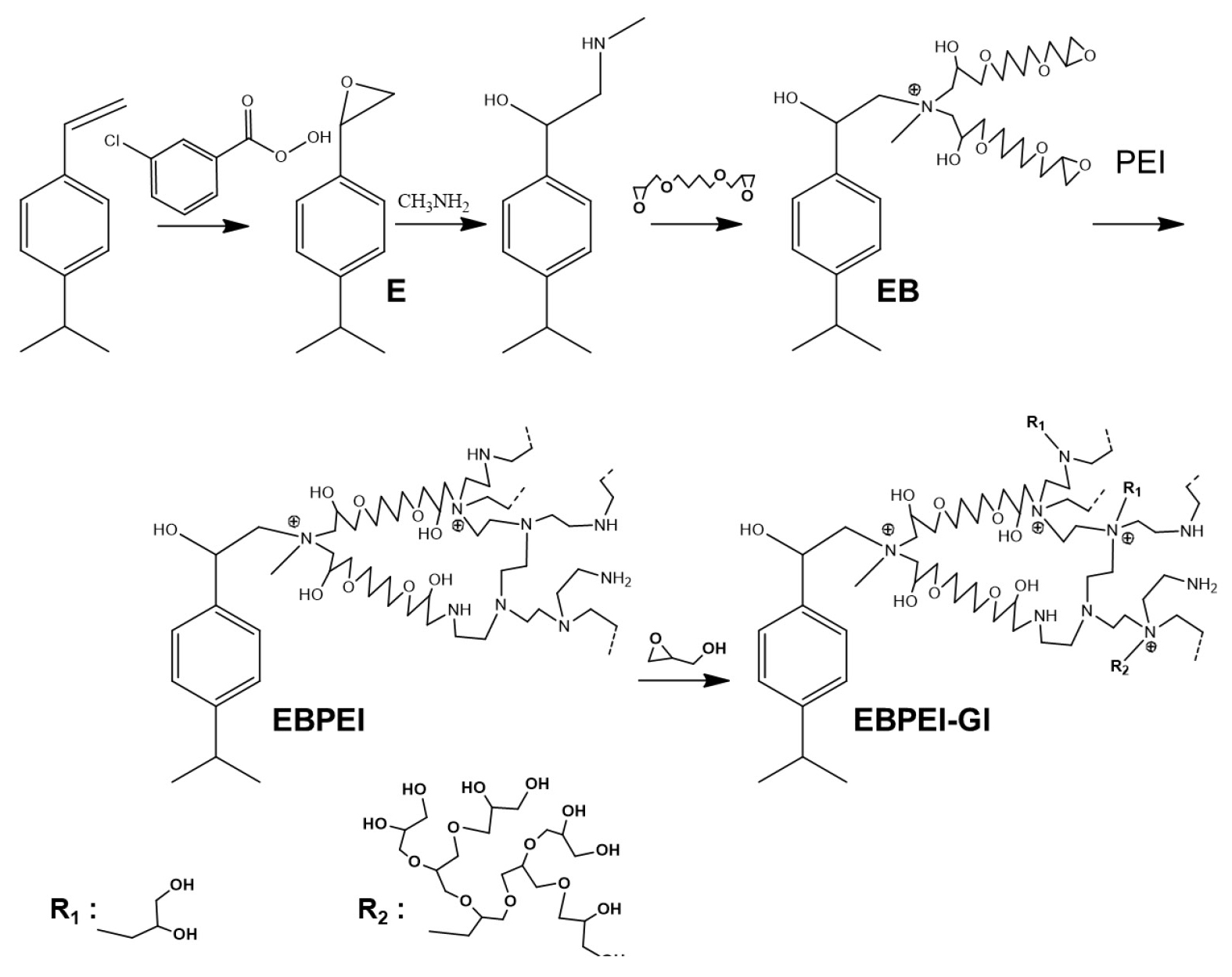 Рис. 1. Схема получения и предполагаемая структура сорбентов на основе эпоксидированного ПС-ДВБ: R1 — замес- титель у атома азота ПЭИ для фаз EBPEI-Gl 1 и EBPEI-Gl 2, R2 — для фазы EBPEI-Gl 2.