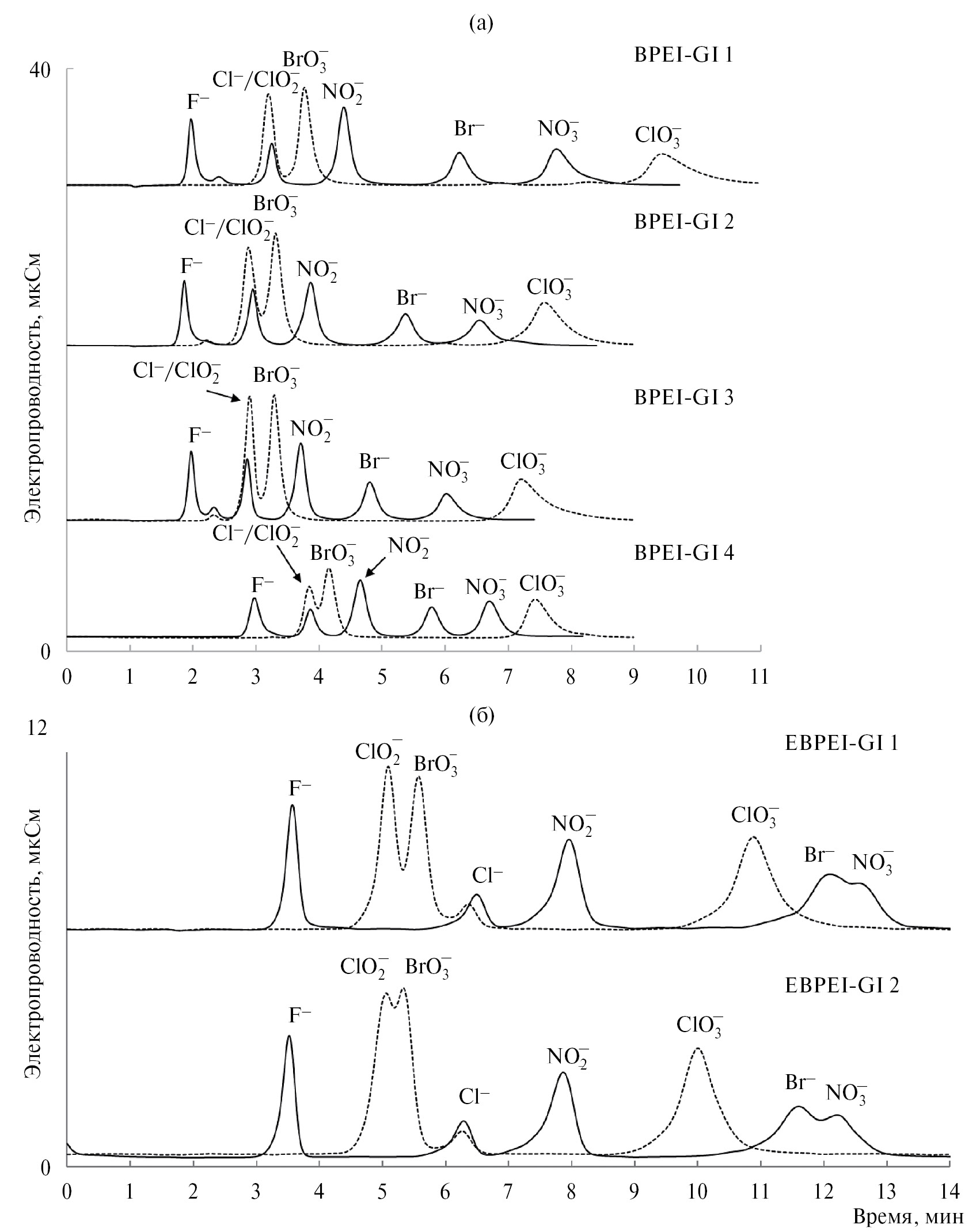 Рис. 2. Хроматограммы стандартных однозарядных анионов и оксогалогенидов на сорбентах, полученных для оценки влияния (а) полимеризации глицидола при повышении pH реакционной среды и (б) способа модифицирования матрицы. Условия: (а) — элюент: BPEI-Gl 1, BPEI-Gl 2 — 8 мМ раствор KOH, BPEI-Gl 3 — 3 мМ раствор KOH, BPEI-Gl 4 — 4 мМ раствор KOH. Скорость потока: 0.95 мл/мин; (б) — элюент: EBPEI-Gl 1 – 4 мМ раствор KOH, EBPEI-Gl 2 – 2 мМ раствор KOH. Скорость потока: 1 мл/мин.