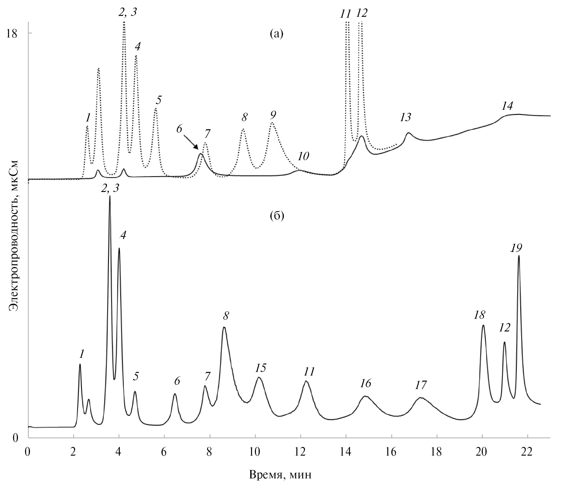 Рис. 3. Хроматограммы смеси стандартных неорганических анионов, оксогалогенидов и анионов (а) галогенуксусных или (б) алкилфосфоновых кислот на колонке BPEI-Gl 4: 1 – фторид, 2 – хлорид, 3 – хлорит, 4 – бромат, 5 – нитрит, 6 – монохлорацетат, 7 – бромид, 8 – нитрат, 9 – хлорат, 10 – монобромацетат, 11 – сульфат, 12 – фосфат, 13 – дихлорацетат, 14 – дибромацетат, 15 – 3-[гидрокси(метил)фосфинил]пропионат, 16 – трет-бутилфосфонат, 17 – этефон, 18 – бутилфосфонат, 19 – глифосат. Элюент: (а): 0−12 мин: 2 мМ раствор KOH, 12−15 мин: 2−40 мМ раствор KOH, 16−20 мин: 40−60 мМ раствор KOH; (б): 0–17.5 мин: 2.5 мМ раствор KOH, 17.5–27.5 мин: 2.5–40 мМ раствор KOH. Скорость потока: 0.95 мл/мин. Температура колонки: 20о