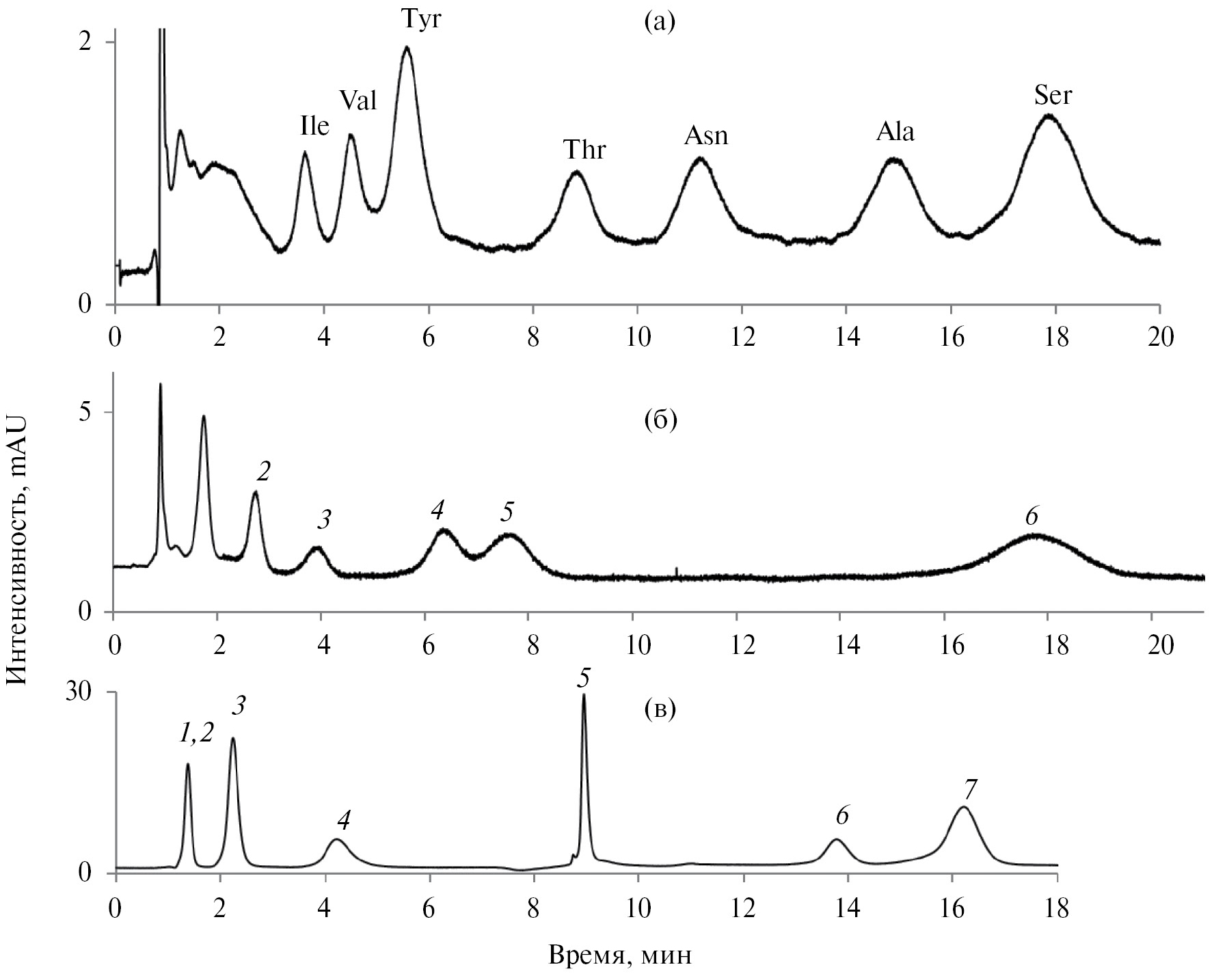 Рис. 5. Хроматограммы модельных смесей на сорбенте EBPEI-Gl 1: (а) — аминокислот, (б) — сахаров, (в) — витаминов. Условия: (а): элюент см. рис. 4б; скорость потока: 1 мл/мин; (б): элюент: CH3CN–H2O (85 : 15, по объему); скорость потока: 1 мл/мин; УФ-детектирование при 190 нм. 1 – рибоза, 2 – фруктоза, 3 – глюкоза, 4 – сахароза, 5 – лактоза, 6 – рафиноза. (в): Элюент: CH3CN–100 мМ аммонийно-формиатный буферный раствор с pH 3.0; градиентное элюирование: 0−5.5 мин — 7% буферного раствора, 5.5—8.0 мин — 7−30% буферного раствора; скорость потока: 1 мл/мин, УФ-детектирование при 270 нм; 1 — никотинамид, 2 — B1, 3 — B6, 4 — B2, 5 — B12, 6 — C, 7 — никотиновая кислота